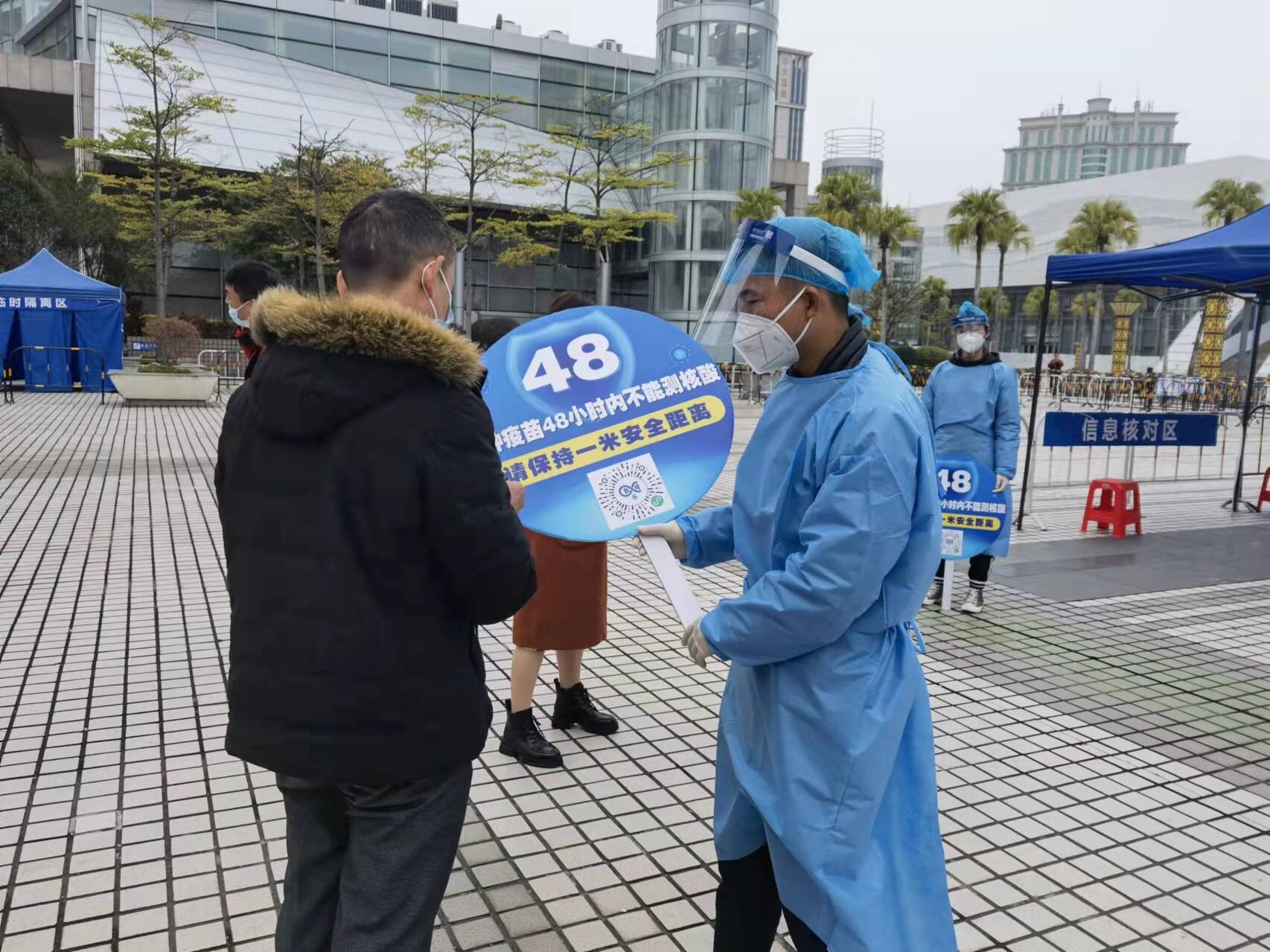 为全力确保核酸采样工作有序开展,区城市管理和综合执法局支援华侨广场核酸检测点的先锋队个个铆足干劲,各司其职,有序引导入场的市民排队、帮助群众扫码生成“葵花码”;登记年纪较大的老人为“家人”信息等。每个先锋队都充分发挥党群干部坚强战斗堡垒作用,他们不顾冷得通红的双手、冻僵的双脚、风刮的刺痛的耳朵,跑出区城管疫情防控“加速度”,让党旗在一线迎风飘扬。