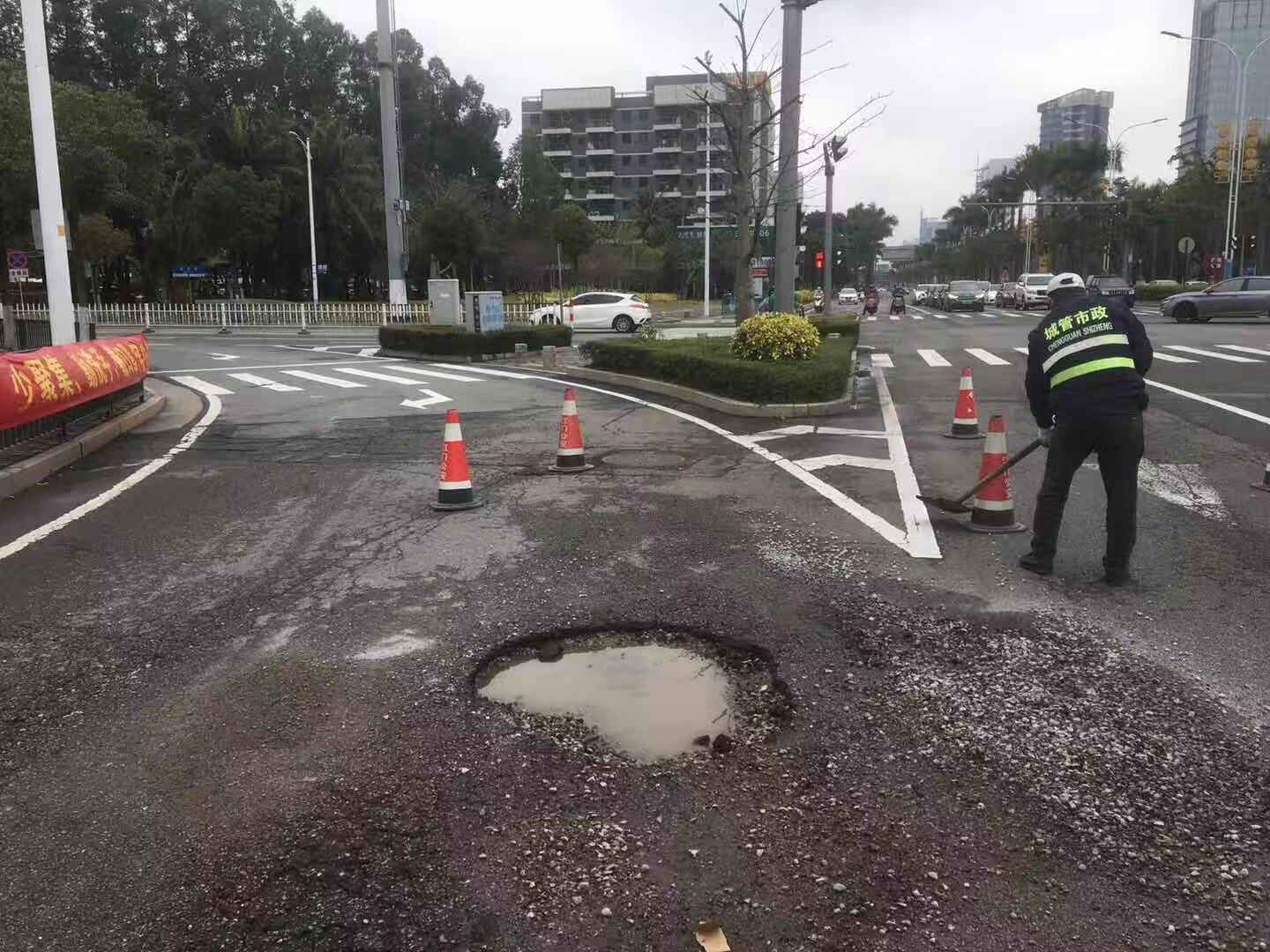 在龙福路双朗小学往建设路红绿灯处,市政工人不畏风雨,正在抢修坑洼路段,确保市民出行环境安全有序。