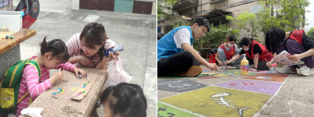 “日常生活中,有许多的事物都与垃圾分类相关,我们可以发挥自己的想象力,比如破损的衣物可以当作抹布;易拉罐可以制作成手工艺品……”活动中,志愿者通过身边的例子,循循引导亲子自由发挥想象力和创造力,将垃圾分类元素融入地绘创作,画出属于自己的“垃圾分类”。
