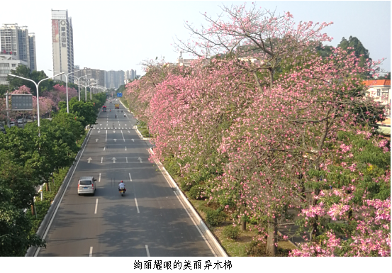 此外,美丽异木棉树形高大,树冠呈伞形,具有较强的抗风能力,盛花时花开热烈,是江门地区少见的秋冬季节开花乔木,是城市绿化美化中值得推广的优良树种。