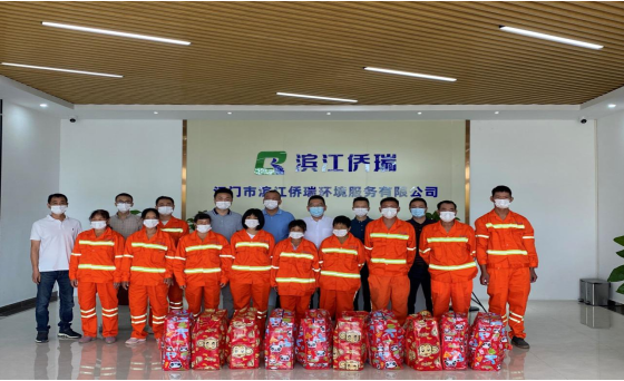 何锡基一行首先来到江门市滨江侨瑞环境服务有限公司,向该公司的环卫工人代表发放节日慰问品。