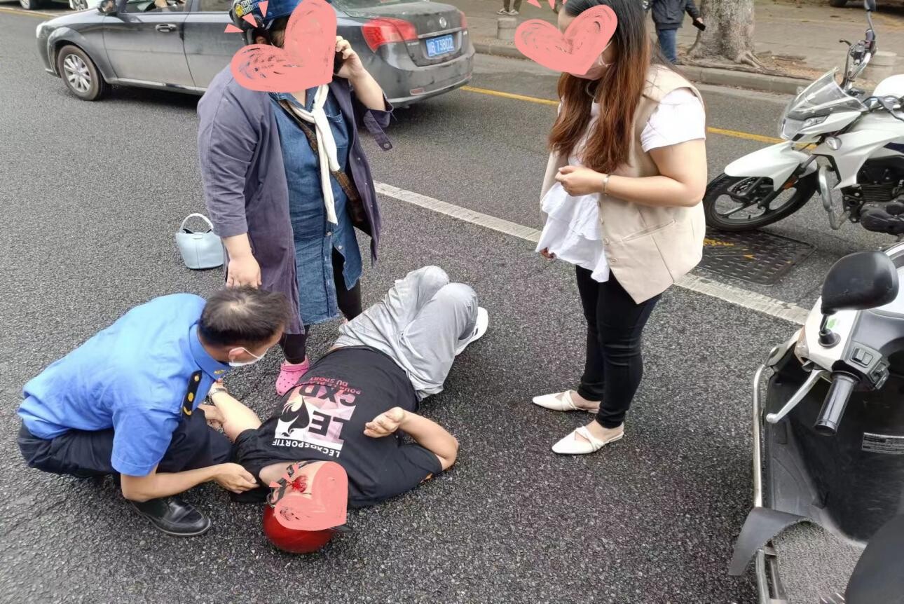 同一时间,暖心的一幕也在另一头上演着。另一组队员梁健能在值守远航市场期间,巡查至永盛二路,发现一女子驾驶摩托车发生交通事故。