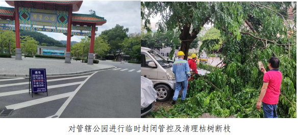 台风来临期间,7月16日16时至7月17日11时,出动230人次,出动88车次,处理因台风突发雷雨天气造成的城区主次干道倒伏树木61棵,已处理61棵;断枝207棵,已处理207棵。同时,根据市、区三防指挥部启动防风Ⅱ级应急响应,对各管辖公园进行临时封闭管控,文明有序劝导市民离开,并加强公园绿植及设施的安全检查,发现隐患及时处理。