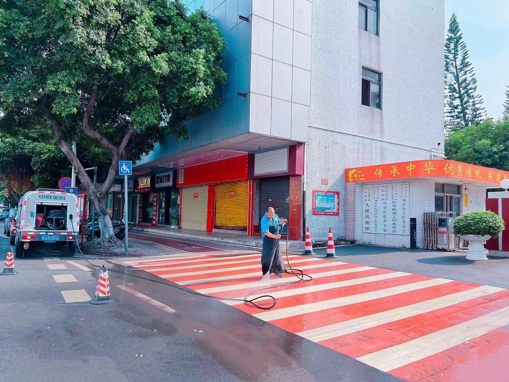 机械化作业显著提升工作效率。区城管局每天对主干道开展高压冲洗、机械清扫、喷雾降尘作业,利用小型冲洗车对人行道板进行高压冲洗,全面提高道路保洁质量。