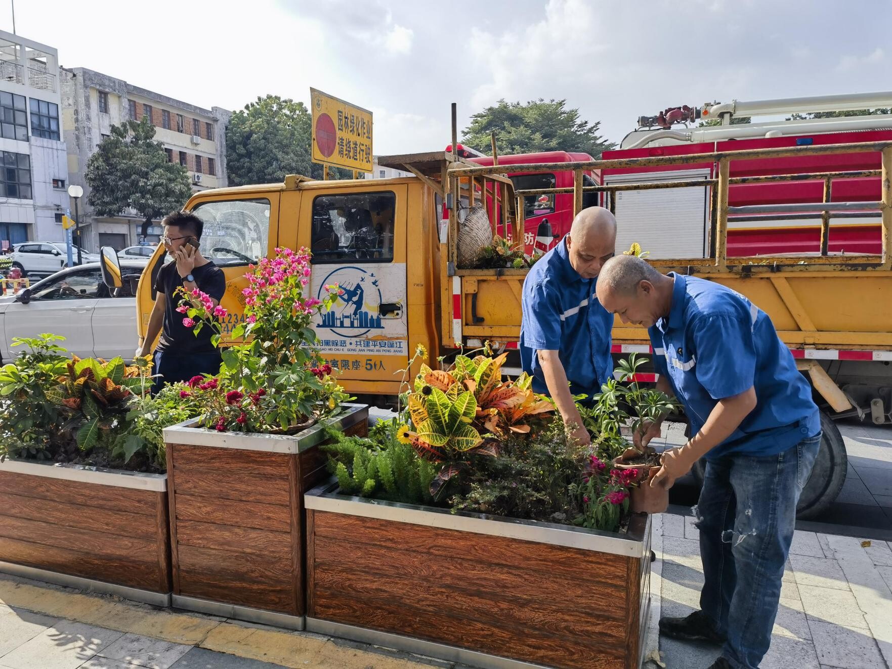 更换长堤风貌街花箱的干枯植物