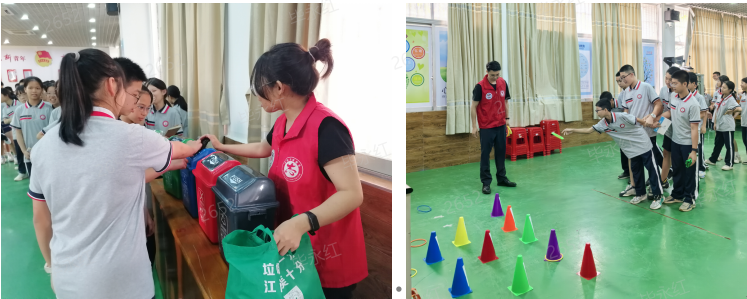 科普环节结束后,活动现场还设置了“垃圾分一分”“分类娱乐套圈”等趣味小游戏,“旧报纸可不可以卖了换钱呢?可以卖了换钱的就是可回收物,要投放到蓝色垃圾桶。”在“垃圾分一分”游戏中,工作人员耐心地指导同学正确进行垃圾分类。同学们通过参与互动游戏有机会获得笔筒、手帕纸、垃圾袋等小礼品,现场气氛热烈活跃。