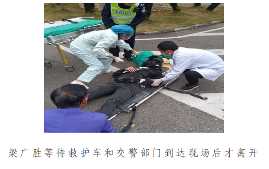 梁广胜一边询问情况安抚伤者情绪并协助伤员联系家属;另一边让轿车司机和周边市民协助拨打急救和报警电话。待医护人员和交警到达现场,他协助护送伤者登上救护车,并和交警说明情况后才离开。