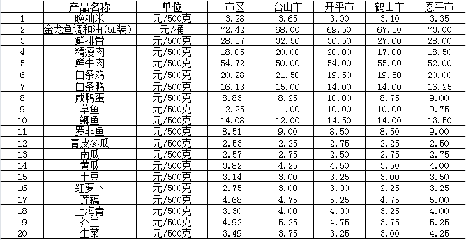 说明:1、表中价格为该地区监测点综合平均价;2、“市区”含澳洲幸运10 、江海区、新会区,价格分别采自澳洲幸运10 市场、江南市场、城东市场等13家农贸市场;3、其他四个县市价格分别采自新华市场、锦江市场等8家农贸市场。