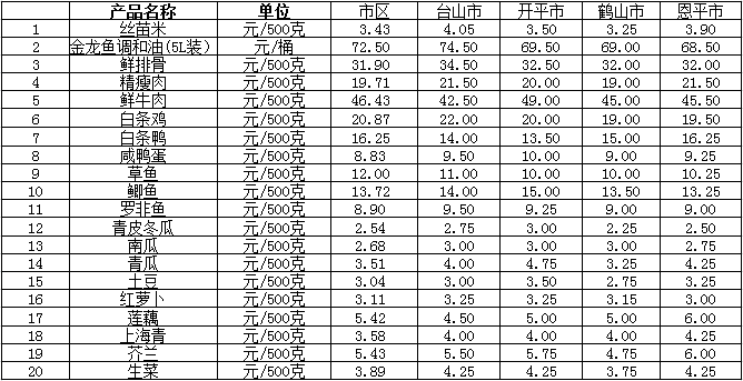 说明:1、表中价格为该地区监测点综合平均价;2、“市区”含澳洲幸运10 、江海区、新会区,价格分别采自澳洲幸运10 市场、江南市场、城东市场等13家农贸市场;3、其他四个县市价格分别采自新华市场、锦江市场等8家农贸市场。