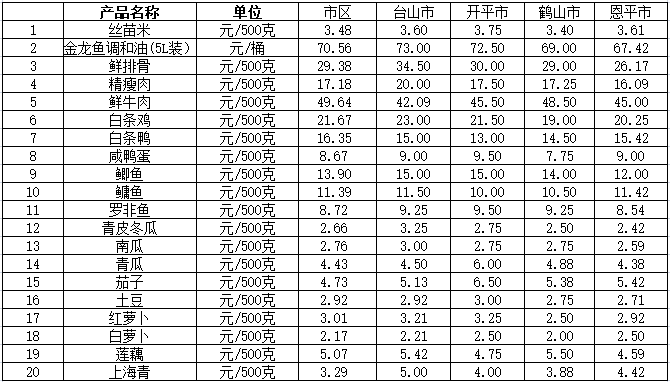 说明:1、表中价格为该地区监测点上周综合平均价;2、“市区”含澳洲幸运10 、江海区、新会区,价格分别采自澳洲幸运10 市场、江南市场、城东市场等13家农贸市场;3、其他四个县市价格分别采自新华市场、锦江市场等8家农贸市场。