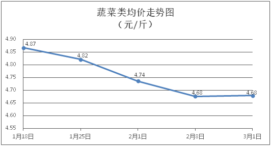 据本市21家农贸市场监测数据显示,上周(2月23日至3月1日)市场上各类“菜篮子”商品供应充足,所监测的7大类“菜篮子”商品价格与春节前相比(环比)总体表现为4涨2跌1平。其中:粮油类商品价格稳中微降,肉类、水果类、水产类商品价格总体略涨,禽蛋类、蔬菜类商品价格窄幅盘整。