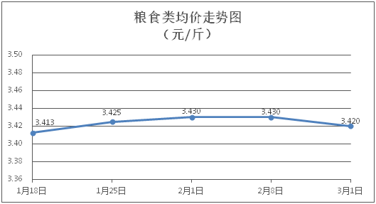 粮食类商品价格稳中微降。所监测的粮食类商品价格波动情况为3跌1平,综合零售均价为每斤3.420元,环比下降0.29%。其中:丝苗米、面粉零售均价分别为每斤3.54元、3.43元,环比分别持平、下降0.58%。