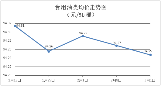 食用油类商品价格微幅波动。所监测的食用油(5L装)商品价格波动情况为3涨3跌3平,综合零售均价为每桶94.25元,环比下降0.02%。其中:鲁花花生油、金龙鱼调和油零售均价分别为每桶155.99元、70.51元,环比分别上涨0.01%、下降0.16%。