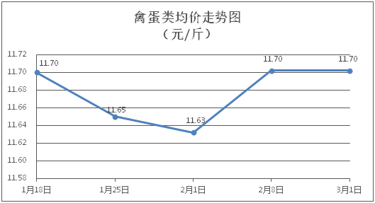 禽蛋类商品价格窄幅盘整。所监测的禽蛋类商品价格波动情况为3涨2跌,综合零售均价为每斤11.70元,环比持平。其中:白条鸡、白条鸭零售均价分别为每斤21.25元、15.28元,环比分别上涨0.19%、上涨0.39%;鸡蛋、咸鸭蛋零售均价分别为每斤6.28元、8.75元,环比分别下降0.63%、下降0.79%。