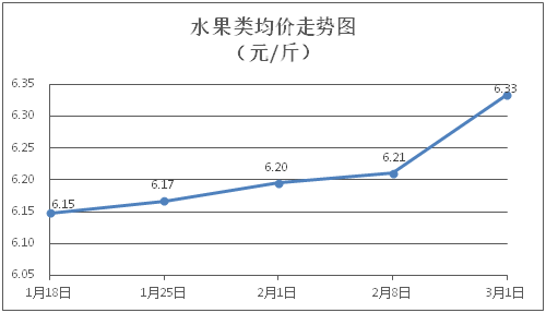 水果类商品价格总体略涨。所监测的水果商品价格波动情况为3涨3跌,综合零售均价为每斤6.33元,环比上涨1.99%。其中苹果、香蕉、梨零售均价分别为每斤7.90元、3.01元、4.99元,环比分别上涨0.51%、上涨3.44%、下降0.99%。