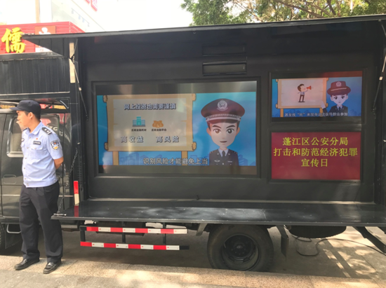 现场除了各个部门各司其职向群众派发宣传单张讲解传授防骗知识外,另外还通过移动电视播放展示我区打击经济犯罪、服务民生的坚定决心和显著成效,积极推动社会各界共同参与打击和防范经济犯罪工作。
