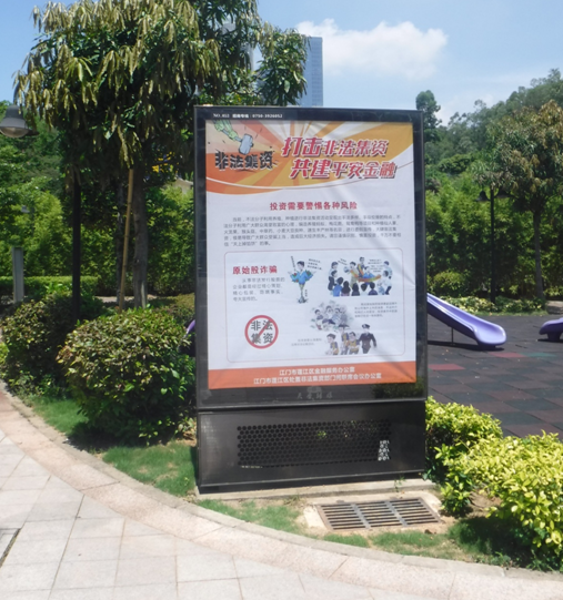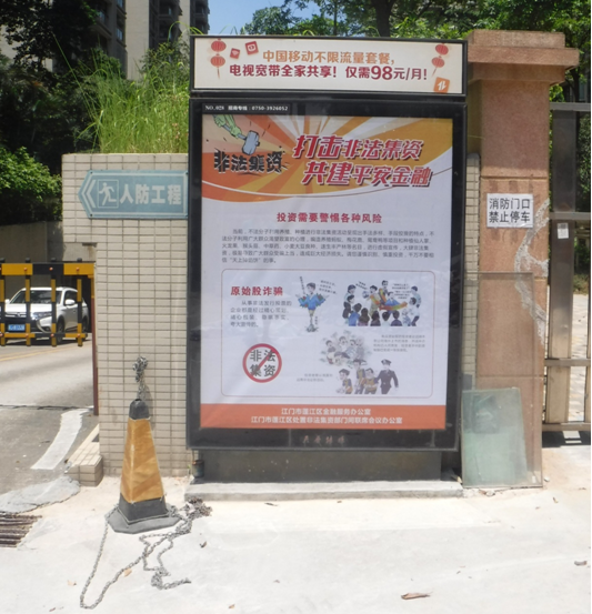 除了现场座谈活动以外,我办还在辖区乡镇及重点地区内投放灯箱广告、粘贴海报等多种形式加强对打击非法集资的宣传。