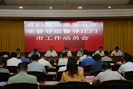 根据省扫黑除恶专项斗争领导小组统一部署,省扫黑除恶第五专项督导组于2018年8月7日至9月6日进驻江门市,开展扫黑除恶专项督导工作。8月8日,江门市委、市政府召开省扫黑除恶第五专项督导组督导江门市工作动员会。
