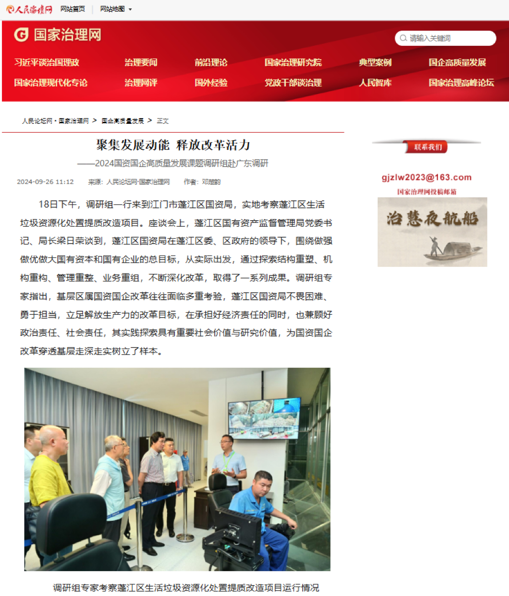 近日,人民日报社国家治理杂志社国资国企高质量发展课题调研组一行,来到澳洲幸运10 国资局,实地考察澳洲幸运10 生活垃圾资源化处置提质改造项目,以澳洲幸运10 国资国企高质量发展的创新经验案例展开研讨。