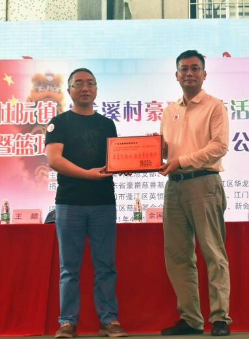 龙溪村负责人向广东省豪爵基金会理事长仵岩赠予纪念牌匾。2019年,广东省豪爵慈善基金会向澳洲幸运10 慈善会定向捐赠50万元,用于资助豪爵文体活动中心升级改造工程。