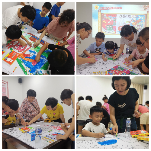 随后,党员干部及其子女共同完成“共画党史百年辉煌卷轴”。他们以画传情、以画抒志,用手中五彩斑斓的画笔描绘出党的光辉历程,一笔一画都深情地表达着对党的感恩之情和对祖国的美好祝愿。大家以分组的形式,从画面的构思到色彩的搭配,共同商讨,分工合作,每一个步骤都一丝不苟。经过1个多小时的精心绘制,一幅幅满含深情的作品呈现在大家眼前,诉说着“我的童心永向党,我的热爱献祖国”的心声。
