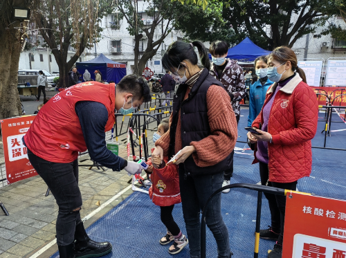 一声号令,民政人闻令而动,穿上标志着志愿者身份的红色马甲,在永盛社区公园核酸检测点各个岗位上为群众服务……