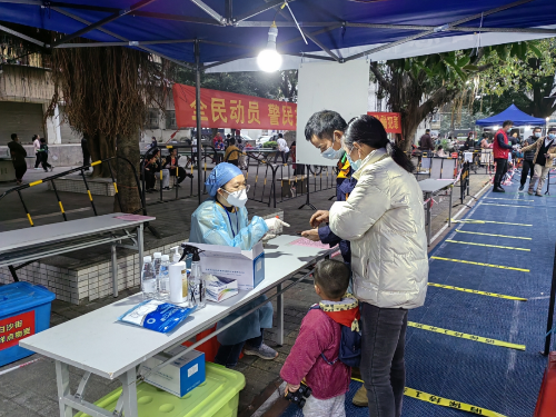 现场部署后,全体党员干部职工积极投入到协助社区开展布场工作,为核酸检测做好一切的准备工作。一切准备就绪,核酸筛查小队各人马上到岗,一次次协助来访群众打开粤康码、行程码,协助长者登记核酸检测码,引导群众有序进行核酸检测……
