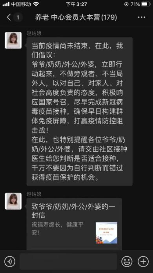 为打通宣传“最后一公里”,各社会组织通过微信群、微信公众号、电话、入户宣传等开展疫苗接种宣传知识,向群众广泛宣传新冠疫苗的安全性和有效性,以及接种注意事项、不良反应和接种疫苗的必要性等知识,呼吁60岁以上的无禁忌症的服务对象积极主动接种疫苗,劝导未接种疫苗的长者能接尽接,使群众认识到疫苗接种在防控新冠肺炎疫情中的重要性,并起到了积极引导作用。