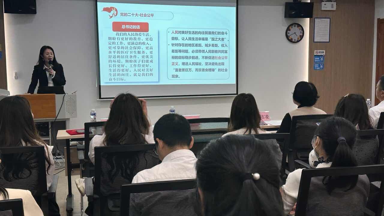 活动当天,丹灶小学教师代表在儿童福利指导中心现场献唱了《把爱唱给你听》,他们用歌声凝聚奋进的精神,用歌声传递真挚的谢意,展现了丹灶小学教师爱国爱校、奋发有为、昂扬向上的精神面貌。丹灶小学林健敏校长以“人民至上重公平正义,学习楷模奋进新征程”为题为党员们上了一堂精彩的党课,让大家再次重温党的二十大精神,通过全国教书育人楷模张桂梅事迹,鼓励党员教师们向楷模学习,向张桂梅校长学习,坚持人民至上办好人民满意的教育,点亮公平之路,不断促进教育发展成果更多更公平惠及全体人民,让教育发展更好地造福广大人民群众。