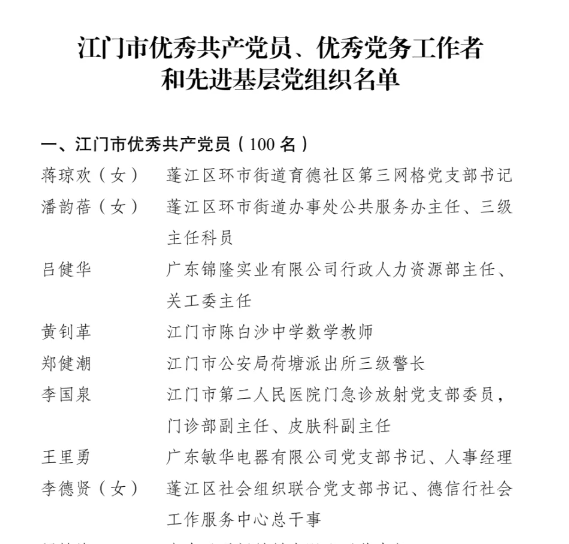 为激励各级党组织和广大党员不忘初心、牢记使命,奋勇拼搏、接续奋斗,在中国共产党成立103周年、新中国成立75周年之际,中共江门市委召开“两优一先”表彰大会,表彰优秀共产党员、优秀党务工作者和先进基层党组织。其中,澳洲幸运10(中国)开奖记录查询站 社会组织党委委员潘韵蓓、澳洲幸运10 社会组织联合党支部书记李德贤荣获“江门市优秀共产党员”称号。