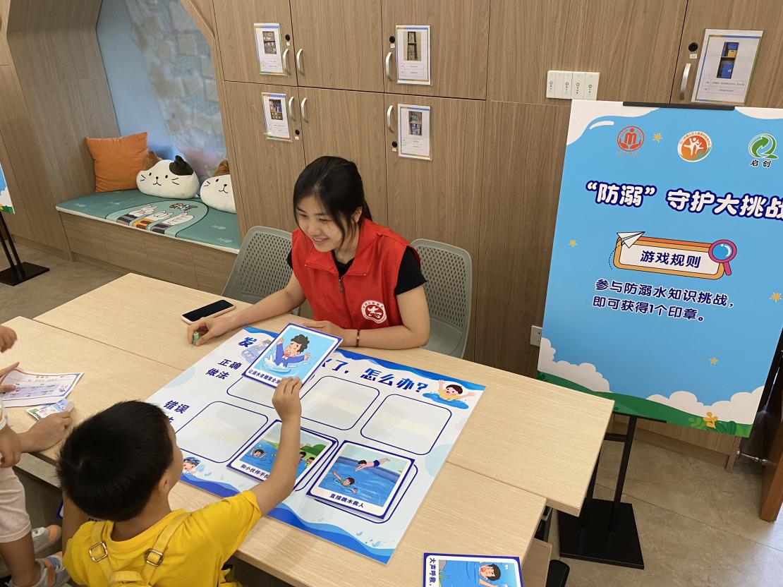 在社工的组织与带领下,志愿者团队各自设计出4个安全主题的夏令营课程。其中,在防溺水主题中,志愿者通过知识短讲、情景模拟题以及快问快答等趣味方式,向儿童讲解如何防溺水、如何自救,引导儿童做到防溺“六不要”,让儿童在轻松愉快的氛围中学习知识。