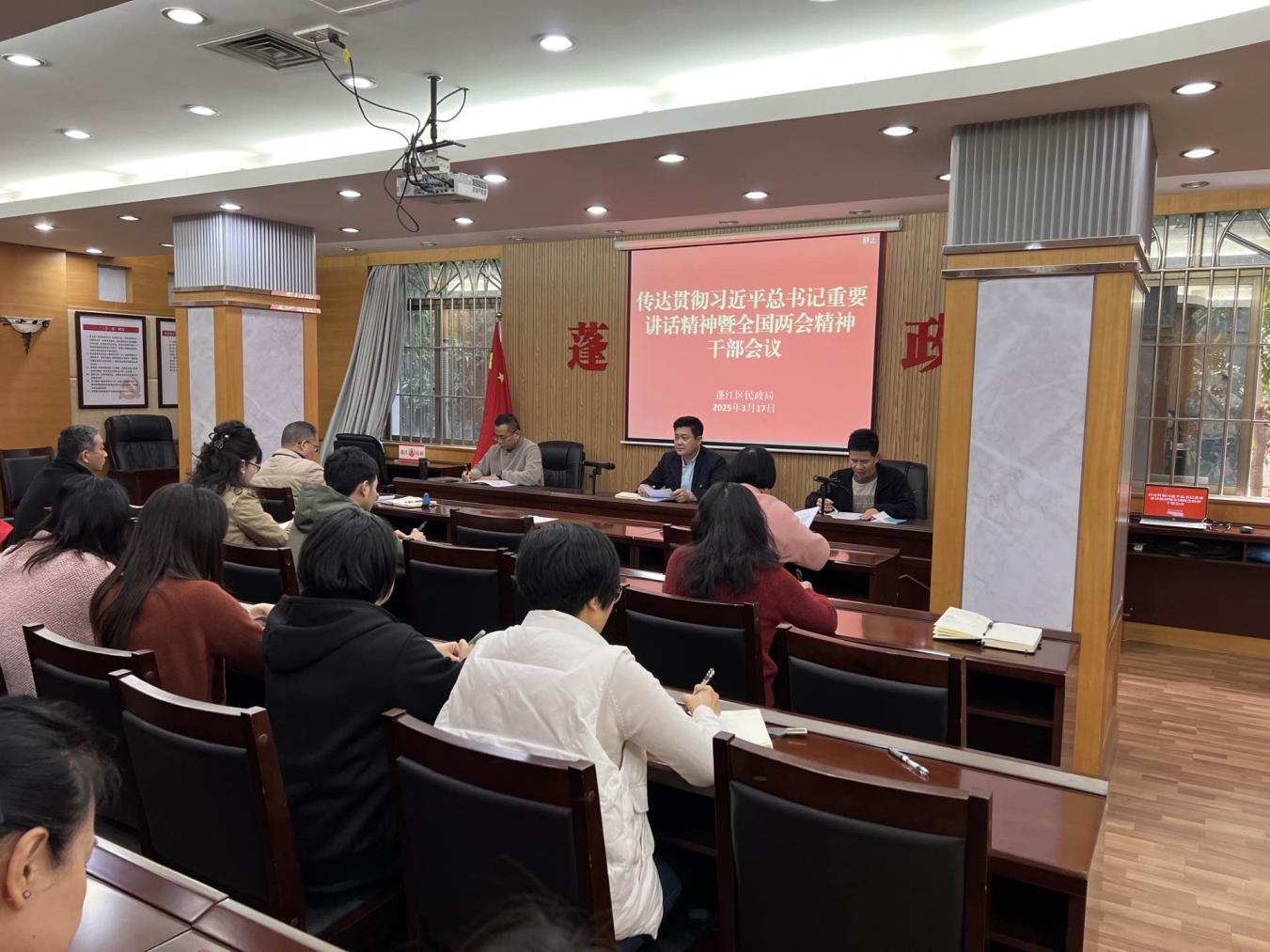 3月17日下午,区民政局召开干部会议,传达学习贯彻习近平总书记重要讲话精神和全国两会精神,部署安排贯彻落实工作。区民政局党组书记、局长余良臻主持会议并讲话,局机关及下属单位全体干部参加会议。