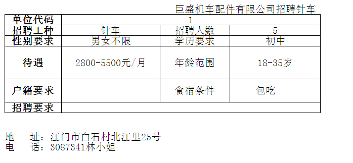 巨盛机车配件有限公司招聘针车
