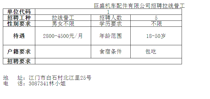 巨盛机车配件有限公司招聘拉线普工