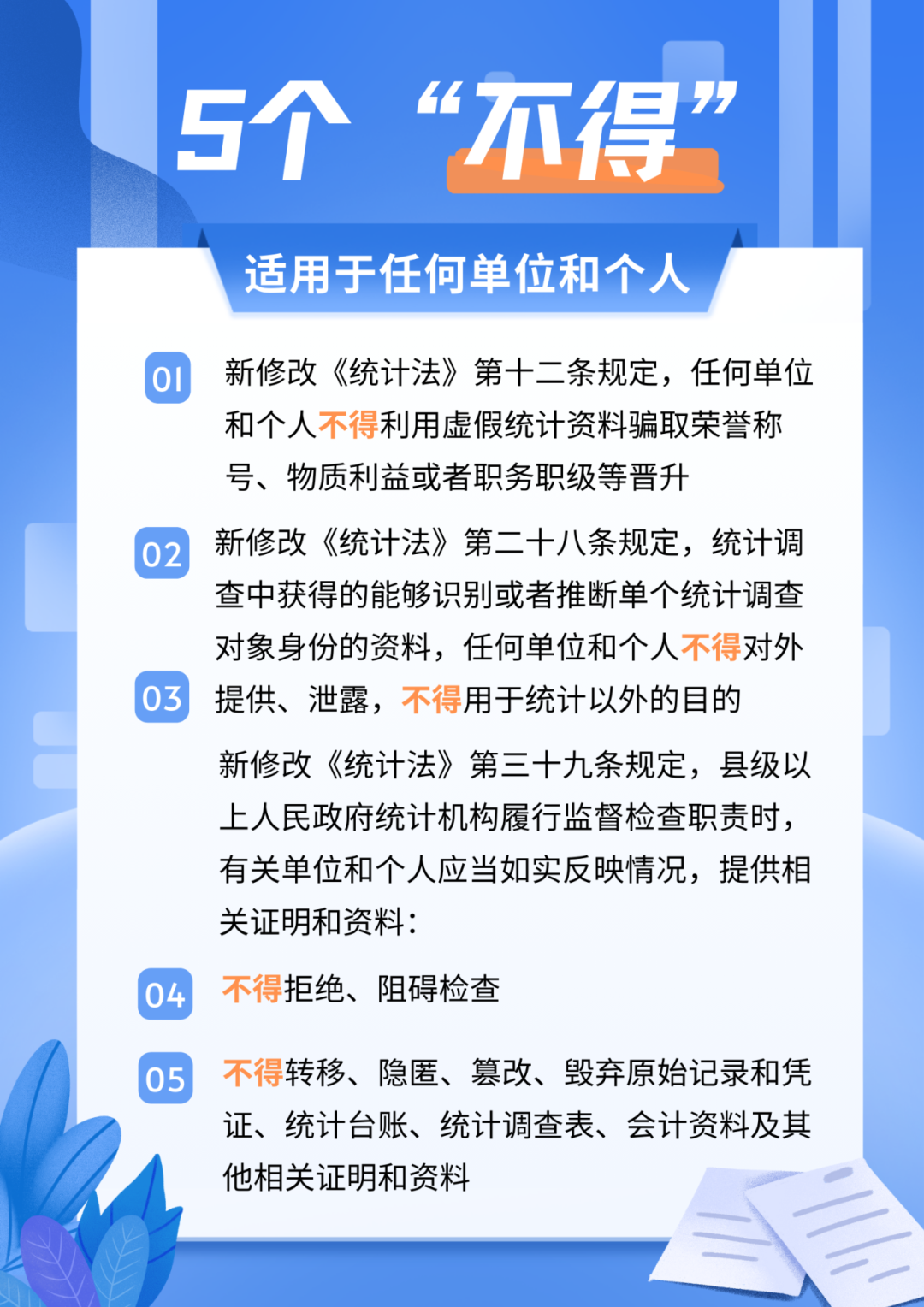 2024年9月13日,新修改的《中华人民共和国统计法》公布施行,其中规定了15个“不得”的禁止性条款是必须遵守的统计法律底线,一旦触碰这些法律底线,都要承担相应的法律责任。具体如下:
