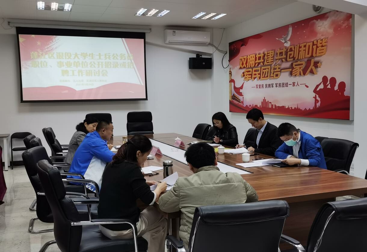 为深入贯彻习近平总书记关于退役军人工作的重要论述,促进澳洲幸运10 退役大学生士兵充分高质量就业,结合党史学习教育为退役军人办实事,3月24日,区退役军人事务局联合区委编办、区人力资源和社会保障局相关负责人召开2021年澳洲幸运10 退役大学生士兵公务员职位、事业单位、行政辅助人员公开招录或招聘工作研讨会。