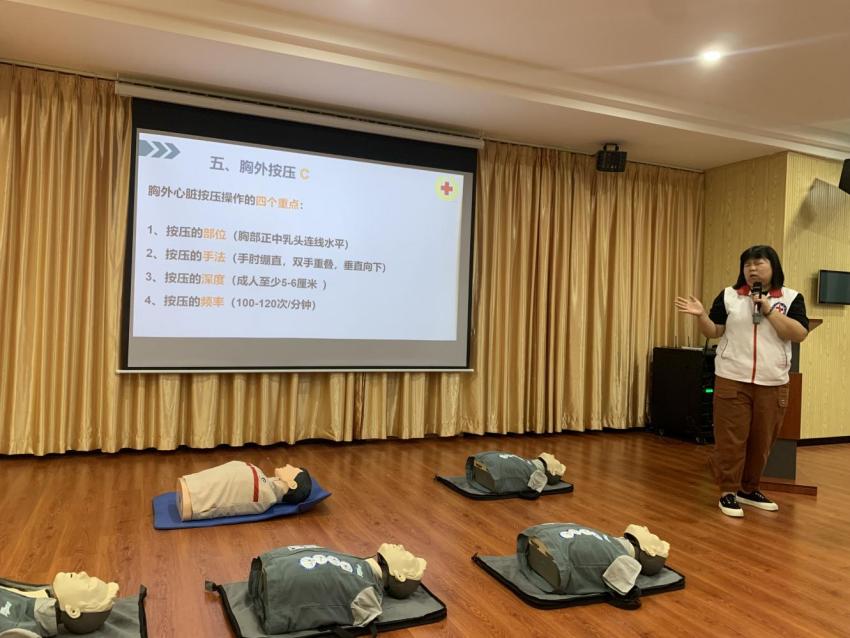 “心肺复苏成功的关键在于‘黄金4分钟’,如果得不到及时抢救和复苏,脑组织将会发生不可逆的损伤,而紧急救护的培训就是为了好好把握这宝贵的几分钟。”培训老师通过理论讲解、实操演示和互动问答等形式,向在场参训人员详细讲解掌握应急救护知识的重要性。 在实操环节,老师手把手教学,指导志愿者们进行心肺复苏、AED使用和创伤救护五项技能的练习,确保大家能够充分掌握并正确运用。
