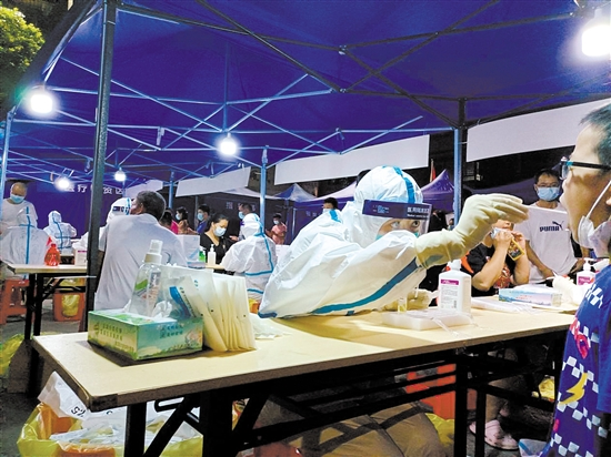 下午3时到5时,顶着大太阳,黄凤仙和队友们上门为幼儿园小朋友提供采样服务。傍晚6时匆匆吃过晚饭后,在家休息待命。当晚上7时,收到临时任务通知后,她立马返岗,和队友们一起将东风社区采样点的4条采样通道增至8条,以减少市民排队时间。