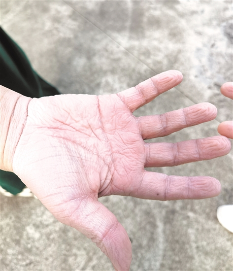 摘下手套的手,被汗水泡得发白发皱。