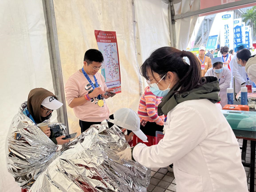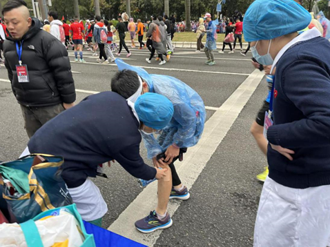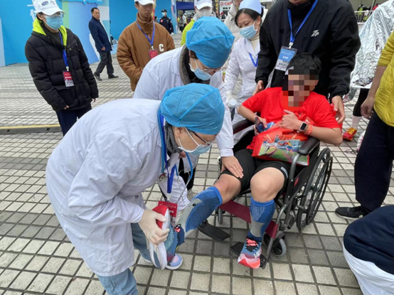 赛中,医疗保障队第一时间发现身体不适选手,及时为患者检查伤势并进行相应医疗救治。