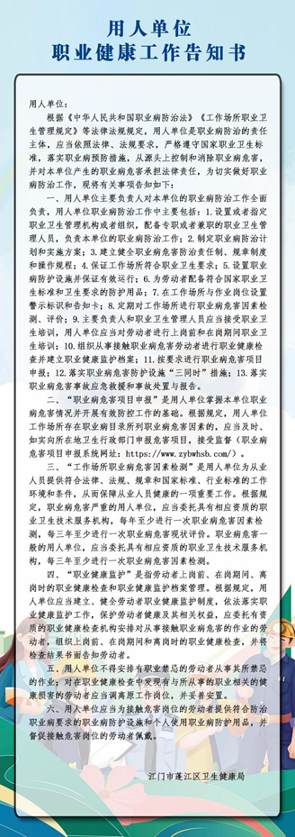 职业健康事关亿万劳动者及其家庭的幸福安康,守护职业健康功在当代,利在千秋。自2003年以来,国家将每年4月的最后一周定为全国《职业病防治法》宣传周,持续推动我国职业健康事业发展。2024年4月25日至5月1日是第22个《职业病防治法》宣传周,今年的主题是“ 坚持预防为主,守护职业健康”,聚焦提升劳动者职业健康素养水平和保障劳动者职业健康权益,普及职业病防治和职业健康知识,进一步推动落实用人单位职业病防治主体责任,切实保障广大劳动者职业健康权益。