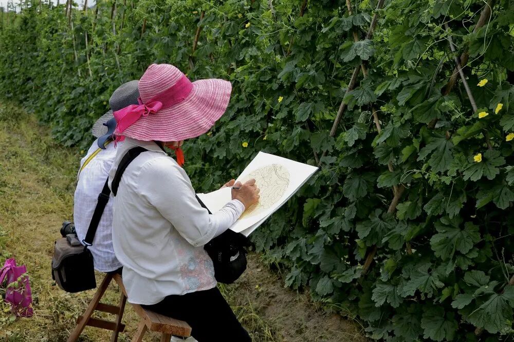 田间沟壑间,不仅有农户、游客在采摘瓜果,还有摄影爱好者、绘画爱好者忙着采风。