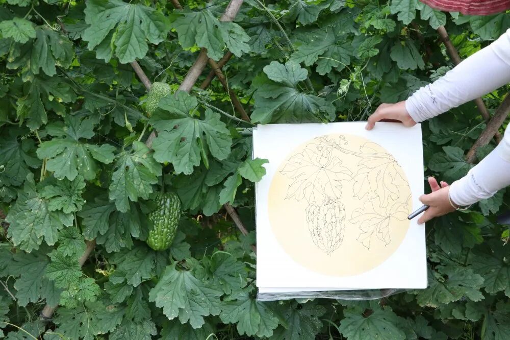 杜阮镇居民吕月笑和她的朋友,把小板凳搬到了田间,一起对着还挂在篱笆上的杜阮凉瓜进行速写,不到10分钟,一幅栩栩如生的杜阮凉瓜图就完成了。