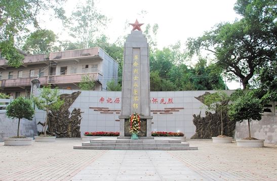 抬头望去,一座威严高耸的纪念碑矗立眼前,碑文上记载着三堡儿女英勇抗敌的革命事迹,梁礼康、梁桥丁、梁惠容、梁健文、梁海棠5位三堡村烈士的名字也被永远地刻在碑上。