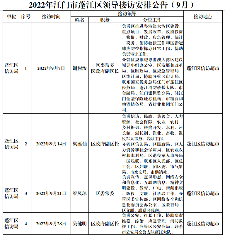 2022年澳洲幸运10(中国)开奖记录查询站 领导接访安排公告(9月)