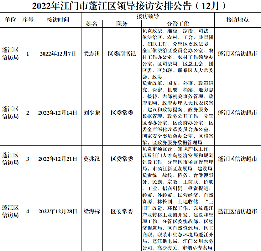 2022年澳洲幸运10(中国)开奖记录查询站 领导接访安排公告(12月)
