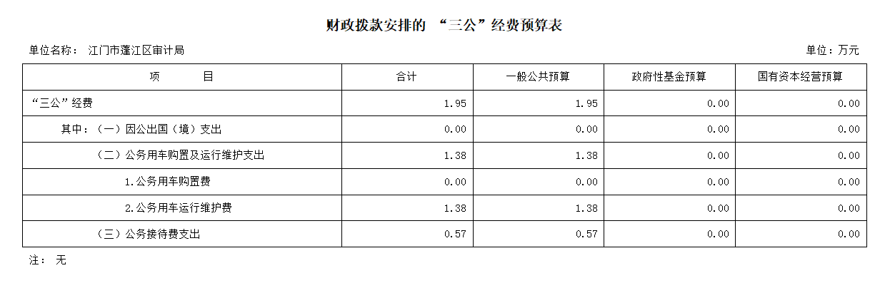 2025年本部门财政拨款安排“三公”经费1.95万元,比上年减少0.03万元,下降1.52%,主要原因是厉行节约,压减“三公” 经费预算。其中:因公出国(境)费0万元,比上年增加0万元, 增长--(基数为0,不可比),主要原因是与上年持平,无增减变化;公务用车购置及运行维护费1.38万元(公务用车购置费0万元,比上年增加0万元;公务用车运行维护费1.38万元,与上年持平,无增减变化。);公务接待费0.57万元,比上年减 少0.03万元,下降5%,主要原因是厉行节约,压减“三公”经费预算。
